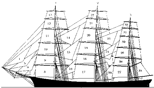 Note that “Mizzen” is a more modern spelling of “Mizen” and that “sail” is frequently abbreviated to “s’l” as in “tops’l” and “stays’l”